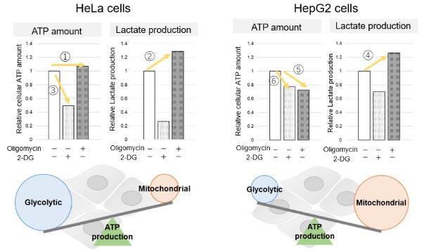 We confirmed the changes in ATP and Lactate production when ATP synthesis by OXPHOS was inhibited by Oligomycin stimulation and by 2-Deoxy-D-glucose (2-DG) in the glycolytic pathway. The results showed that HeLa cells depend on Glycolysis and HepG2 cells depend on OXPHOS to synthesize ATP.
