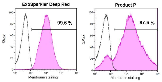 Staining of EVs derived from the CD9–sfGFP–expressing ES-2 ovarian cancer cell line was performed using ExoSparkler DeepRed and Product P, and the samples were analyzed with the CytoFLEX nano* nanoflow cytometer (Beckman Coulter).