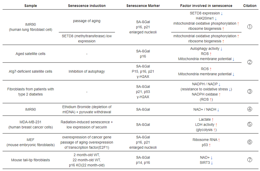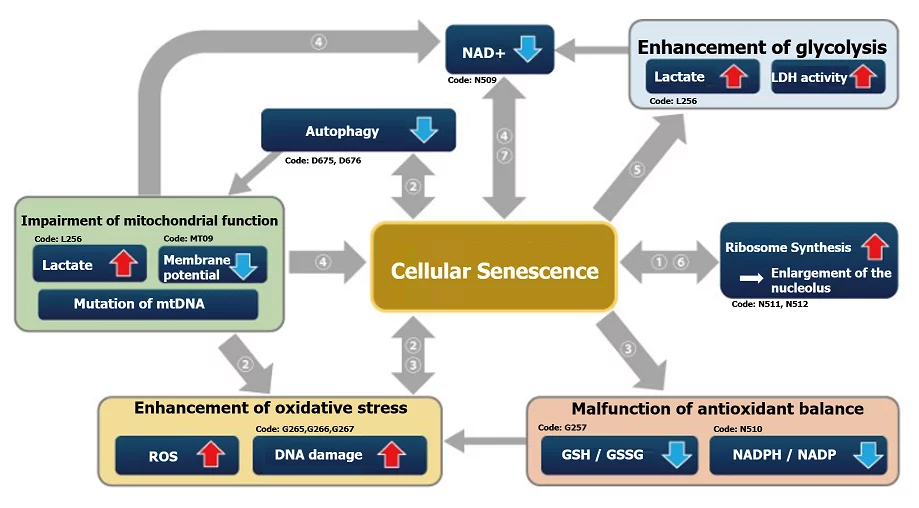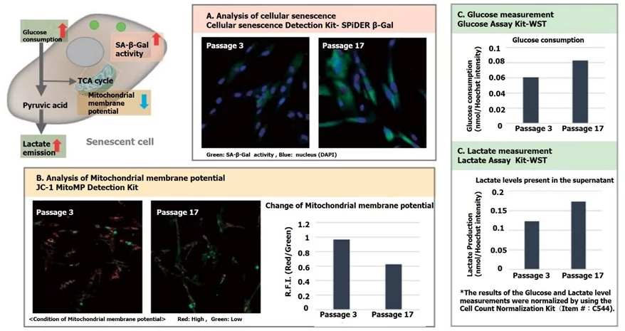 In WI-38 cells at different passages SA-ß-Gal activity, mitochondrial membrane potential, and cellular metabolism (Glucose and Lactate) were evaluated using each specific kit. In senescent cells, SA-ß-Gal activity was enhanced and mitochondrial membrane potential was reduced. Consumption of Glucose and lactate level in the supernatant measured as an indicator of metabolism was increased.