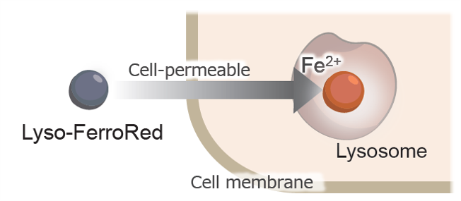 More than 10 years have passed since Stockwell et al. discovered ferroptosis, which is caused by an iron ion-dependent accumulation of lipid peroxides. It has become clear that ferroptosis is a form of cell death, in which free iron (Fe2+) generates reactive oxygen species (ROS) through the Fenton reaction1), which in turn oxidize lipids. More recently, it has been reported that lipid oxidation damages lysosomal membranes and causes iron to leak from lysosomes, thereby spreading it to other cellular organelles2). Lyso-FerroRed can detect intracellular lysosomal free iron (Fe2+). Lyso-FerroRed penetrates the cell membrane and selectively reacts with Fe2+ in lysosomes, emitting strong fluorescence. Reaction between Lyso-FerroRed and Fe2+ is irreversible and differs from those based on the detection principle of calcium iron probes such as Fluo 3. Lyso-FerroRed has no chelating ability.