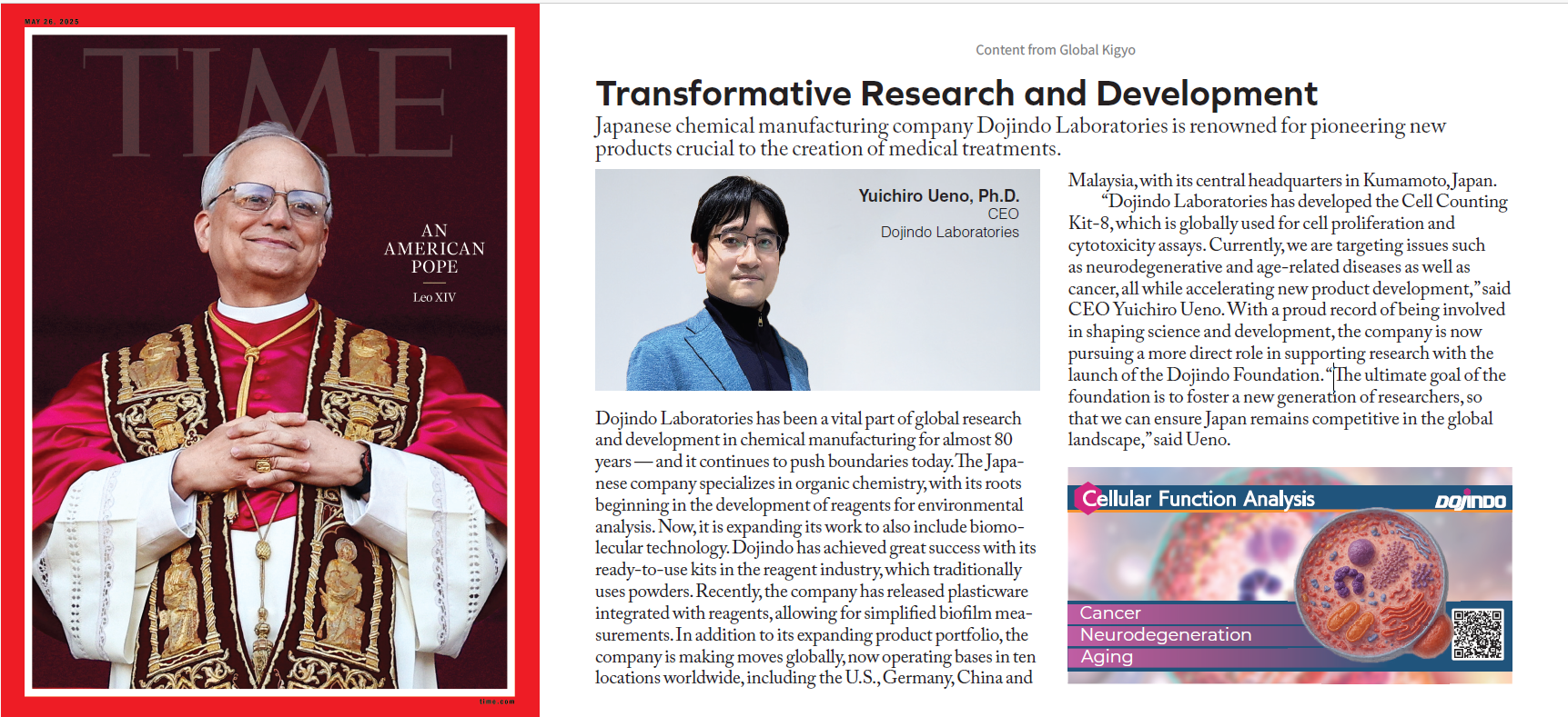 We are pleased to announce that our President and CEO, Uichiro Ueno, was interviewed by Global Kigyo Co., Ltd., and the interview was published in the Asia edition of the international English-language news magazine TIME (May 18, 2025 issue).