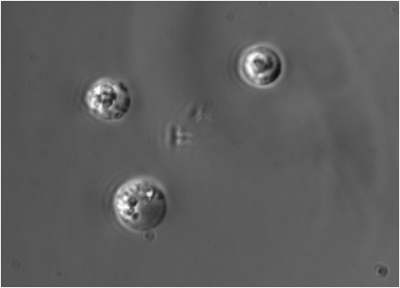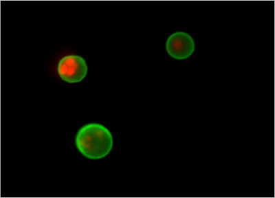Figure 1 Fluorescent imaging of apoptosis induced cells Jurkat cells were apoptosis induced with staurosporine with its concentration of 1 μg/mL at 37 °C for 3.5 hours and then observed under a fluorescent microscope.
