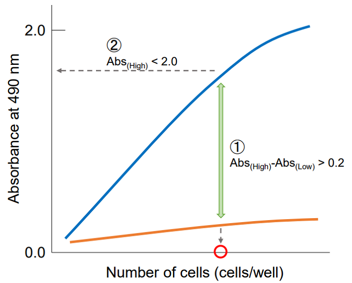 Plot the data by setting cell concentration for the x-axis and absorbance for the y-axis. Then, find the optimum cell number to meet the following condition.