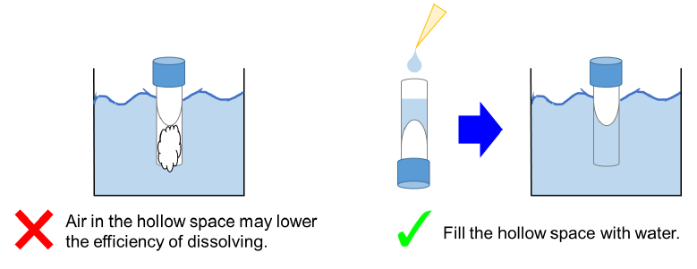 - If Liperfluo solids remain after vortexing, sonicate or heat (40℃, 30 minutes) the tube to dissolve them. To perform sonication effectrively, fill the hollow space with water. See the figure below.