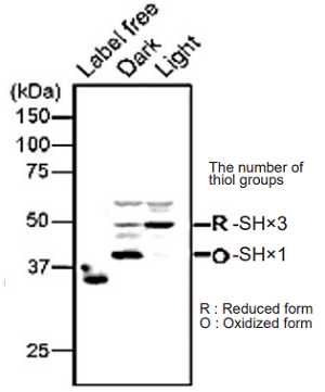 -SulfoBiotics- PEG-PCMal is a reagent to visualize the redox states of protein by electrophoretic analysis. PEGPCMal has a maleimide group that can bind covalently to a protein thiol group. A mobility shift corresponding to about 5 kDa is observed by the electrophoretic analysis when one molecule of PEG-PCMal binds to a thiol group of the target protein. Thus, the number of free thiol groups on a protein can be clearly identified by SDS-PAGE through the mobility shift assay. The conventional reagents, PEG-Maleimide, have been widely used in mobility shift assays, however, transfer efficiency and antibody recognition on western blot are low due to the PEG chains labeled in protein. Because this reagent has a UV photocleavable moiety in the molecule, the PEG chains are cut off from the labeled protein in the gel with UV irradiation after the electrophoresis. Therefore, the protein treated with UV irradiation can be transferred from the gel to PVDF membrane and detected by antibodies.