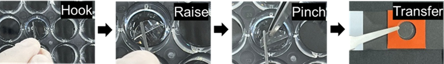 - Raise the Cover Glass (step 5) with a bent-tip needle. Pinch and transfer it with tweezers into the circular area of the Mold (step 6).