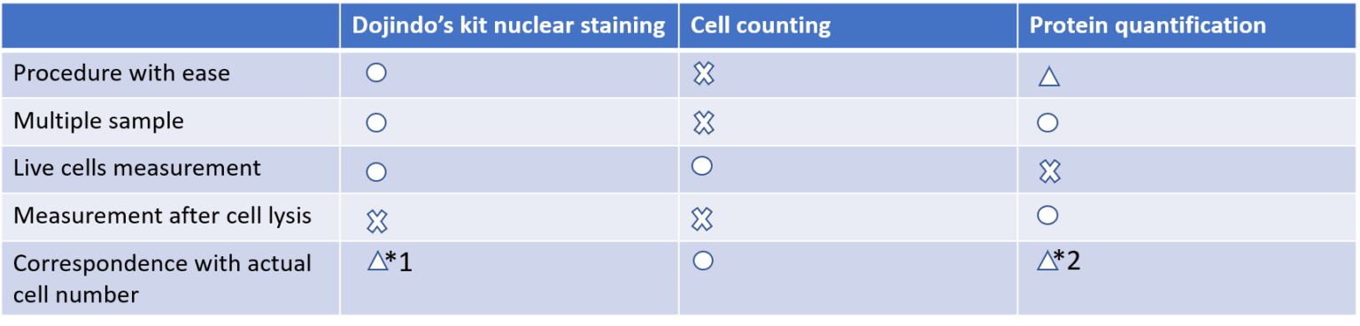 Normalization of the measured values at the time of plate assay is done by using the cell number or nucleus/protein level as an indicator. Among these detection techniques, our nuclear staining kit is easy to use and capable of analyzing multiple specimens.