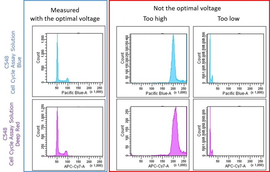 Adjust the measurement voltage to a voltage at which the G0/G1, S-phase, and G2/M-phases are clear in the histogram.