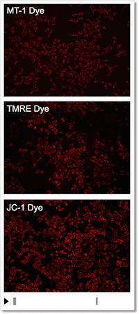 Sometimes it is difficult to detect slight changes of MMP in JC-1 stained mitochondria. In such a case, tetramethylrhodamine ethyl ester (TMRE) was used to monitor MMP. MT-1 can provide equivalent detection sensitivity to TMRE.